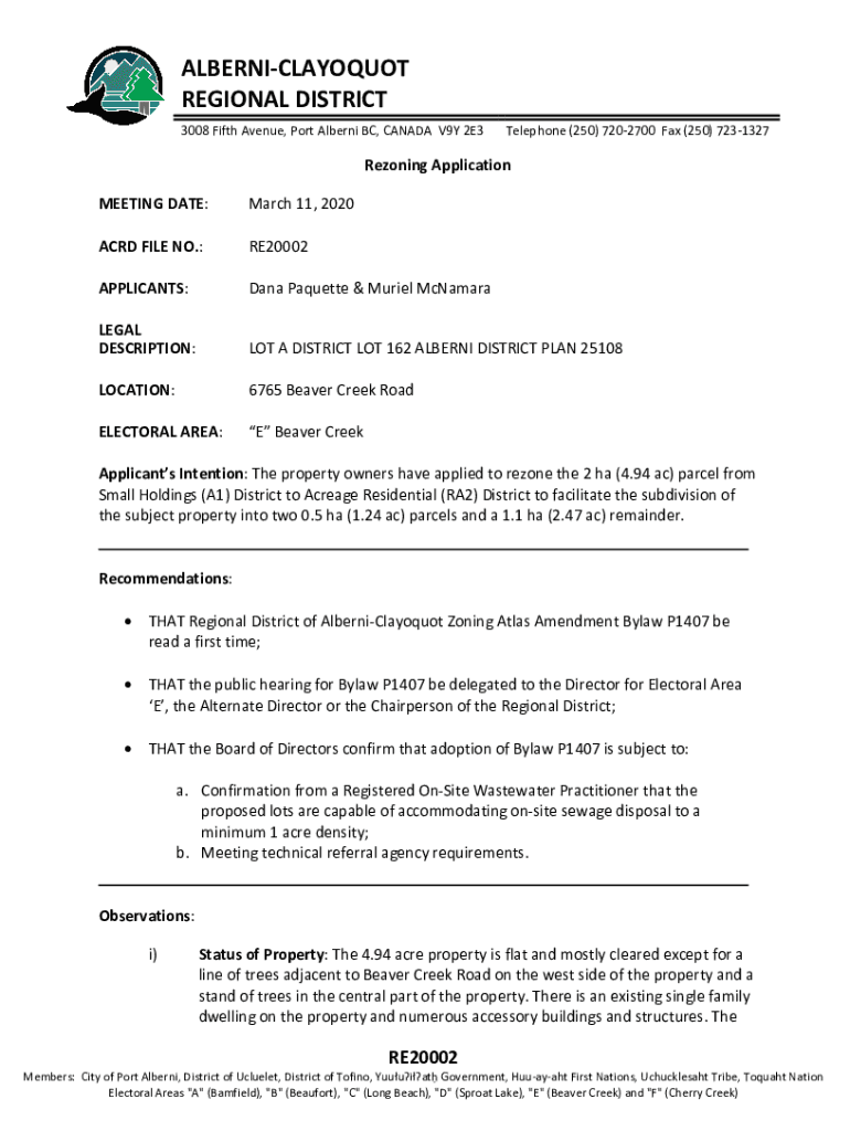 3008 Fifth Avenue, Port Albert BC, CANADA V9Y 2E3Telephone (250) 7202700 Fax (250) 7231327Rezoning Application