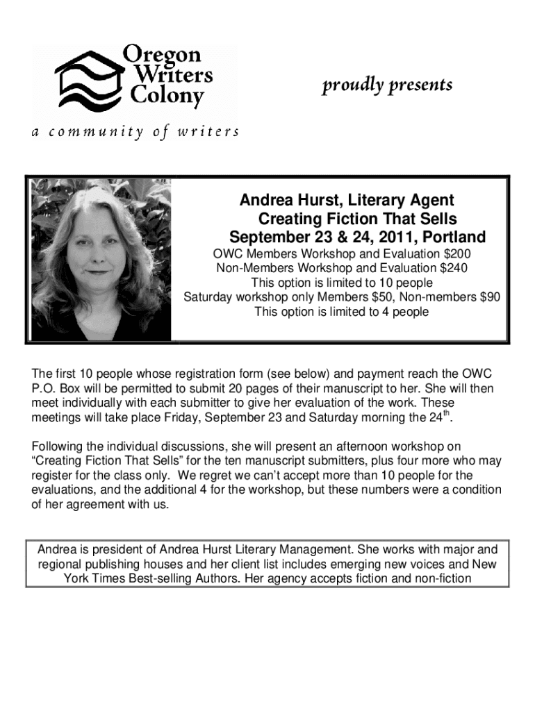 Proudly presents Andrea Hurst, Literary Agent Creating Fiction That Sells September 23 & 24, 2011, Portland OWN Members Workshop and Evaluation $200 Nonmembers Workshop and Evaluation $240 This option