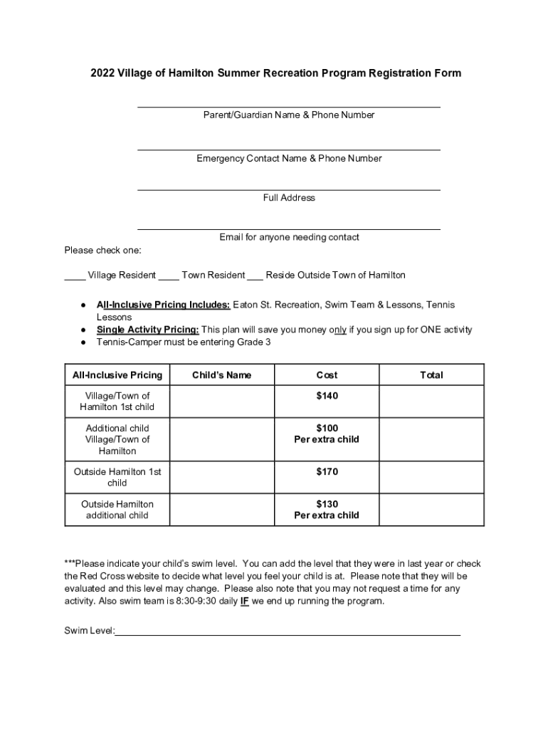 2022 Village of Hamilton Summer Recreation Program Registration Form ___ Parent/Guardian Name & Phone Number ___ Emergency Contact Name & Phone Number ___ Full Address ___ Email for anyone needing