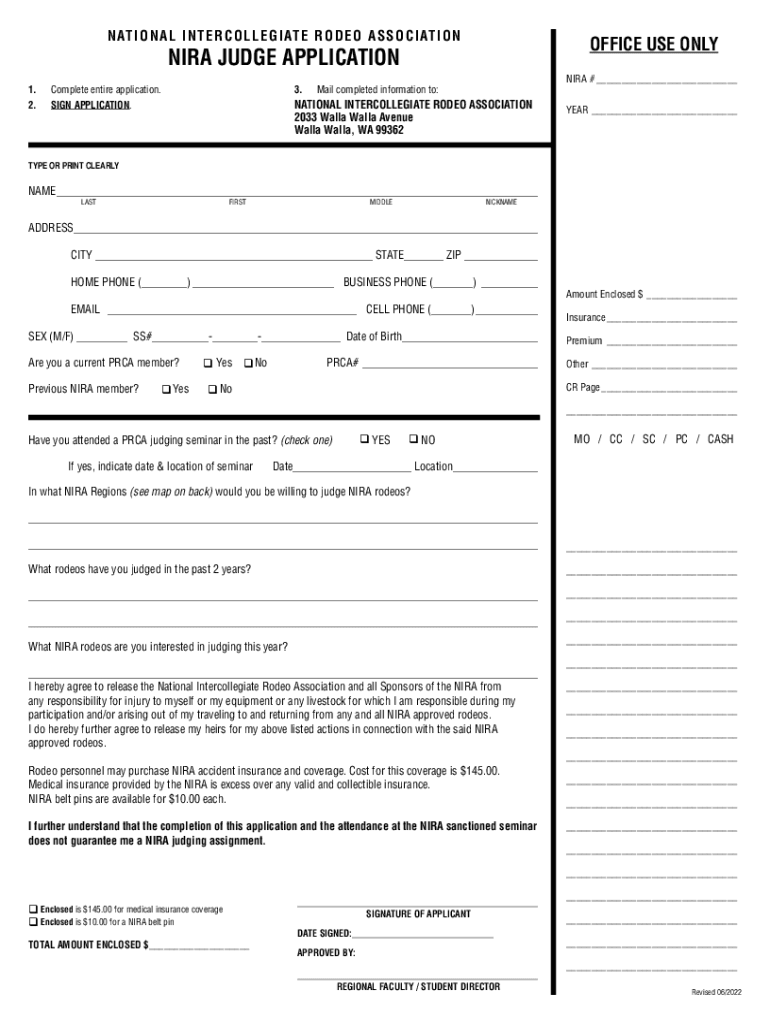 N at i o n an l i n t e r c o l l e g i at e r o d e o an s o c i at i on office use onlyNIRA judge application1.2.3. Complete entire application.