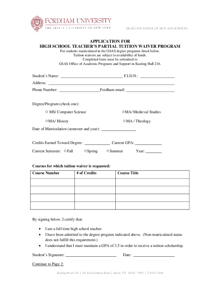 GRADUATE SCHOOL OF ARTS AND SCIENCESAPPLICATION FOR HIGH SCHOOL TEACHERS PARTIAL TUITION WAIVER PROGRAM For students matriculated in the GAS degree programs listed below. Tuition waivers are subject