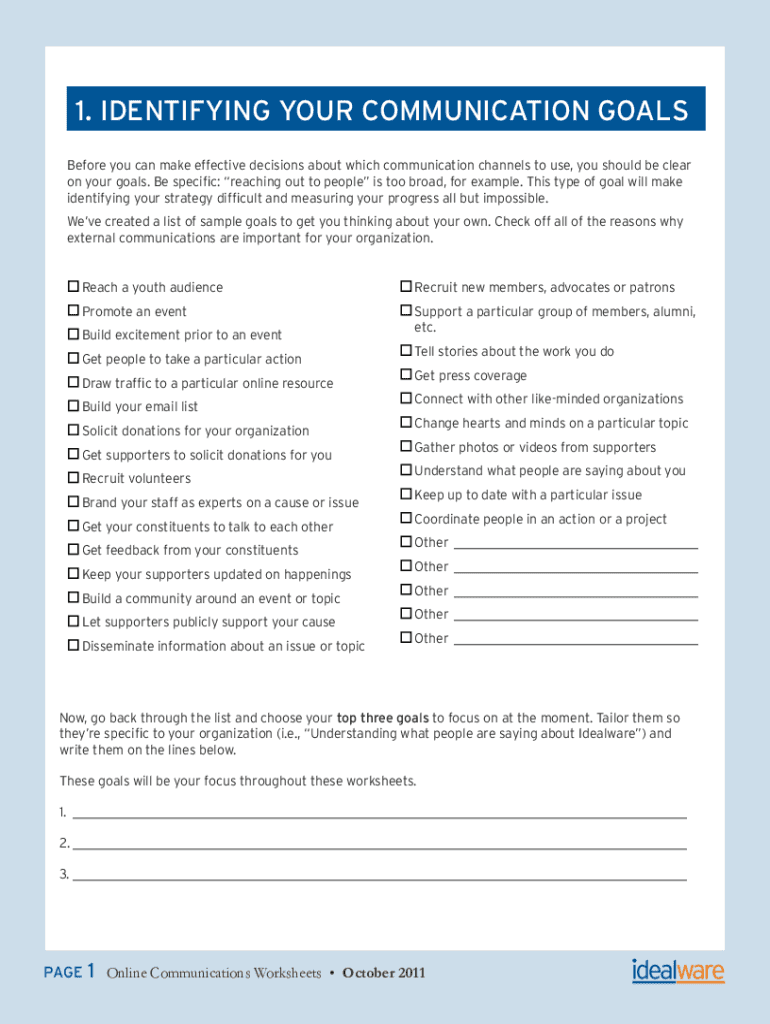 1. Identifying Your Communication Goals Before you can make effective decisions about which communication channels to use, you should be clear on your goals. Be specific: reaching out to people are