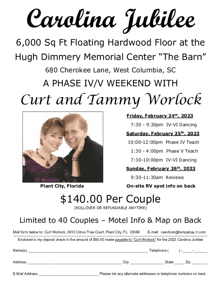 Carolina Jubilee 6,000 Sq Ft Floating Hardwood Floor at the Hugh Dimmer Memorial Center The Barn 680 Cherokee Lane, West Columbia, SCA PHASE IV/V WEEKEND WITH Curt and Tammy Warlock Friday, February