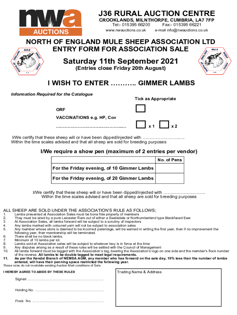 J36 RURAL AUCTION Center CROPLANDS, OGLETHORPE, CAMBRIA, LA7 7FP Tel: 015395 66200www.auctions.co.fax: 015395 66221email info@nwauctions.co.ukNORTH OF ENGLAND MULE SHEEP ASSOCIATION LTD ENTRY FORM