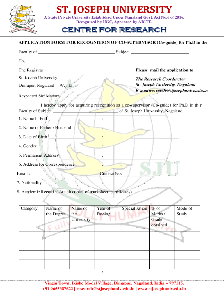 ST. JOSEPH UNIVERSITY A State Private University Established Under Nagaland Govt. Act No.6 of 2016, Recognized by UGC, Approved by ACTE. Center FOR RESEARCH APPLICATION FORM FOR RECOGNITION OF SUPERVISOR
