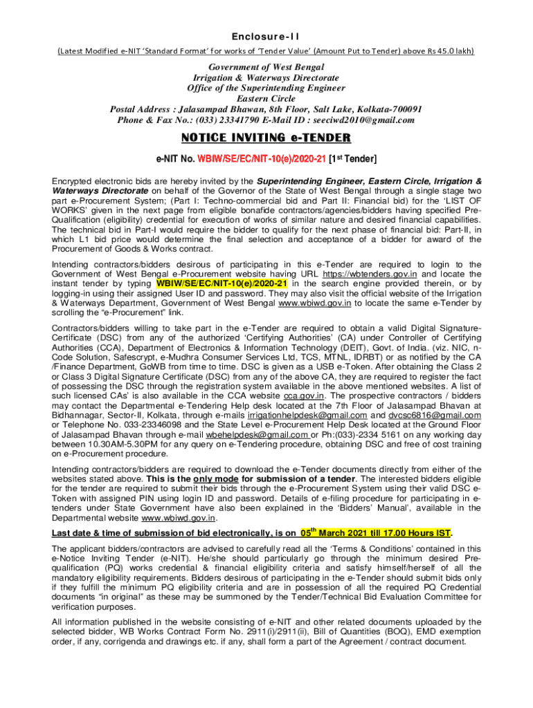 This document outlines the e-tendering process for works valued above Rs 45 lakh by the Irrigation & Waterways Directorate, Government of West Bengal. It details eligibility criteria, submission procedures,