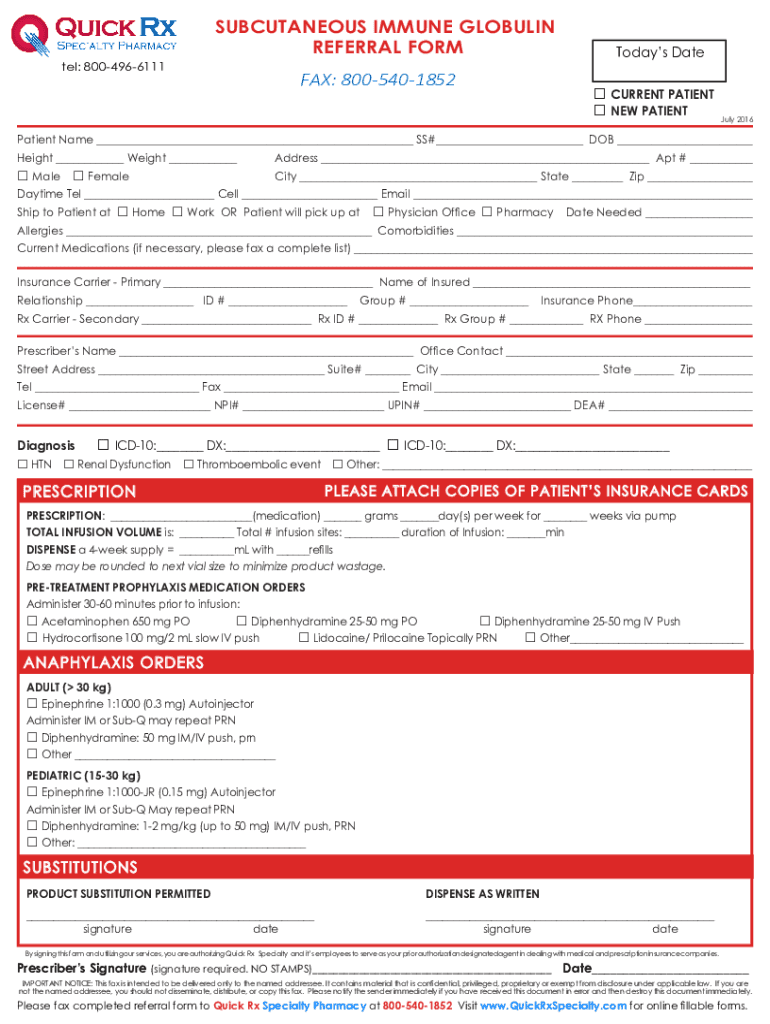 SUBCUTANEOUS IMMUNE GLOBULIN REFERRAL FORM tel: 8004966111FAX: 8005401852Todays Date CURRENT PATIENT NEW PATIENT July 2016Patient Name ___ SS#___ DOB ___ Height ___ Weight ___ Male FemaleAddress ___