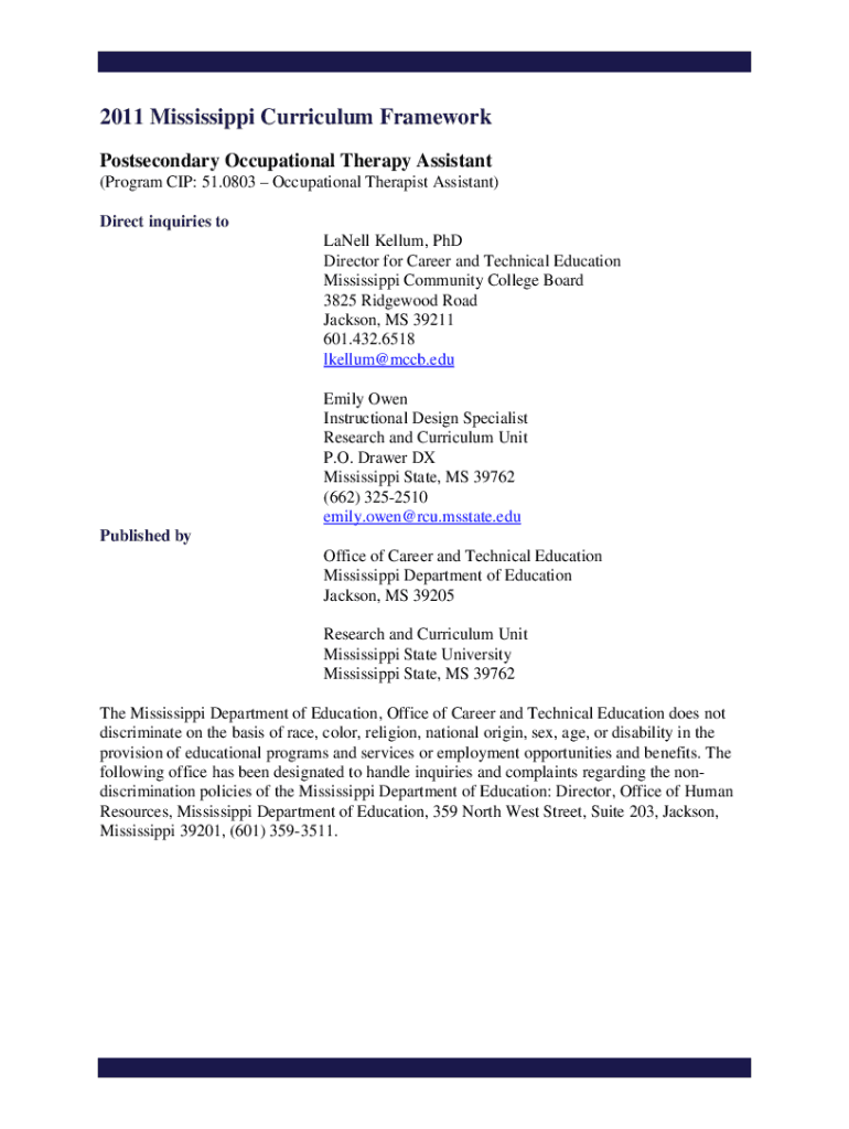 2011 Mississippi Curriculum Framework Postsecondary Occupational Therapy Assistant (Program CIP: 51.0803 Occupational Therapist Assistant) Direct inquiries to Janell Vellum, PhD Director for Career