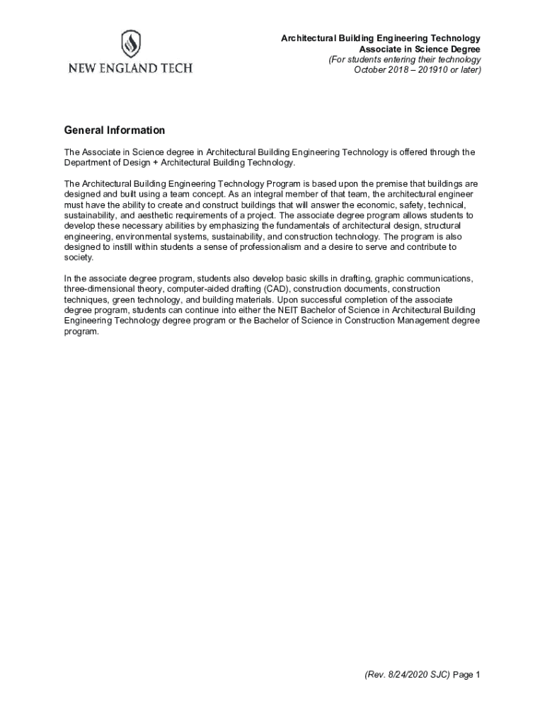 Architectural Building Engineering Technology Associate in Science Degree (For students entering their technology October 2018 201910 or later)General Information The Associate in Science degree in