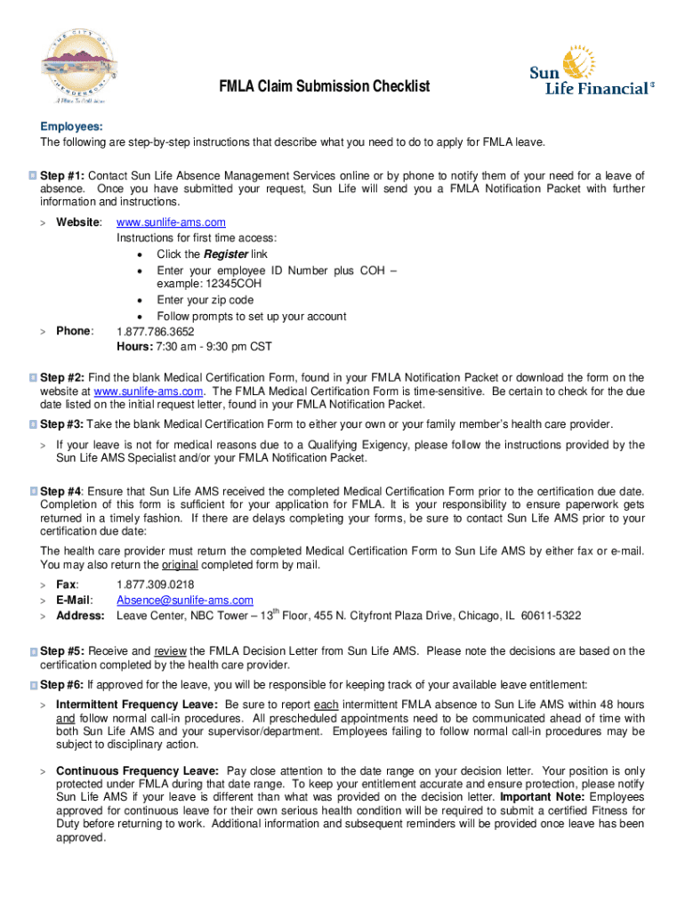 FMLA Claim Submission Checklist Employees: The following are stepsister instructions that describe what you need to do to apply for FMLA leave. Step #1: Contact Sun Life Absence Management Services