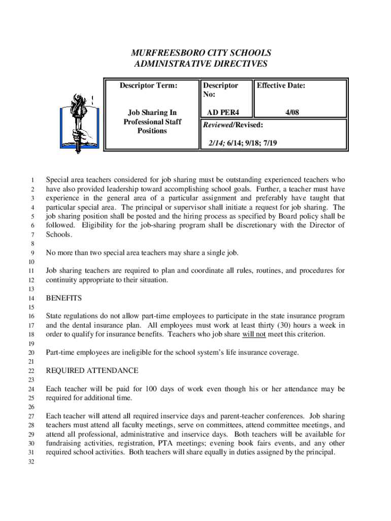 MURFREESBORO CITY SCHOOLS ADMINISTRATIVE DIRECTIVES Descriptor Term:Job Sharing In Professional Staff PositionsDescriptor No:Effective Date:AD PER44/08Reviewed/Revised: 2/14; 6/14; 9/18; 7/191 2 3