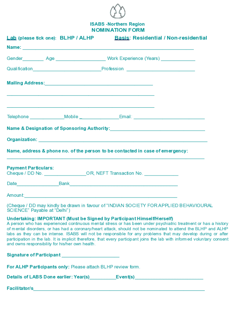 Get the free NOMINATION FORM Lab (please tick one): BLHP / ALHP Basis