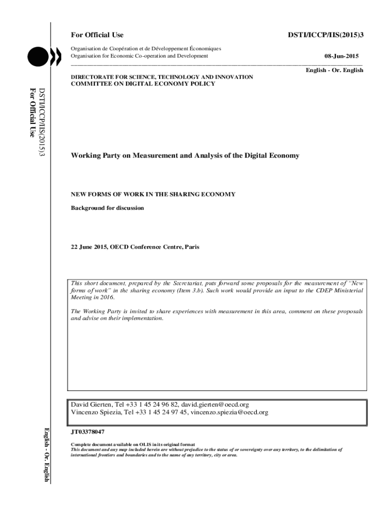 For Official Used STI/CCP/IIS(2015)3Organisation de Cooperation et de Development continues Organization for Economic Cooperation and Development08Jun2015 ___ ___ English Or. English DIRECTORATE FOR
