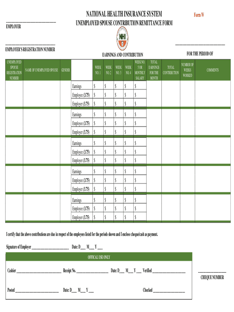NATIONAL HEALTH INSURANCE SYSTEM___ EMPLOYERForm UNEMPLOYED SPOUSE CONTRIBUTION REMITTANCE FORM ______ EMPLOYERS REGISTRATION NUMBER THE PERIOD EARNINGS AND CONTRIBUTION UNEMPLOYED SPOUSE REGISTRATION