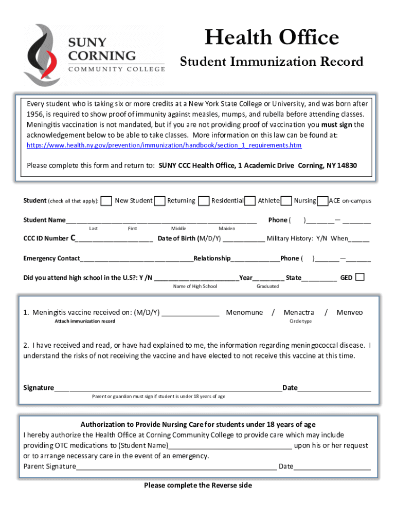 Health Office Student Immunization Record Every student who is taking six or more credits at a New York State College or University, and was born after 1956, is required to show proof of immunity