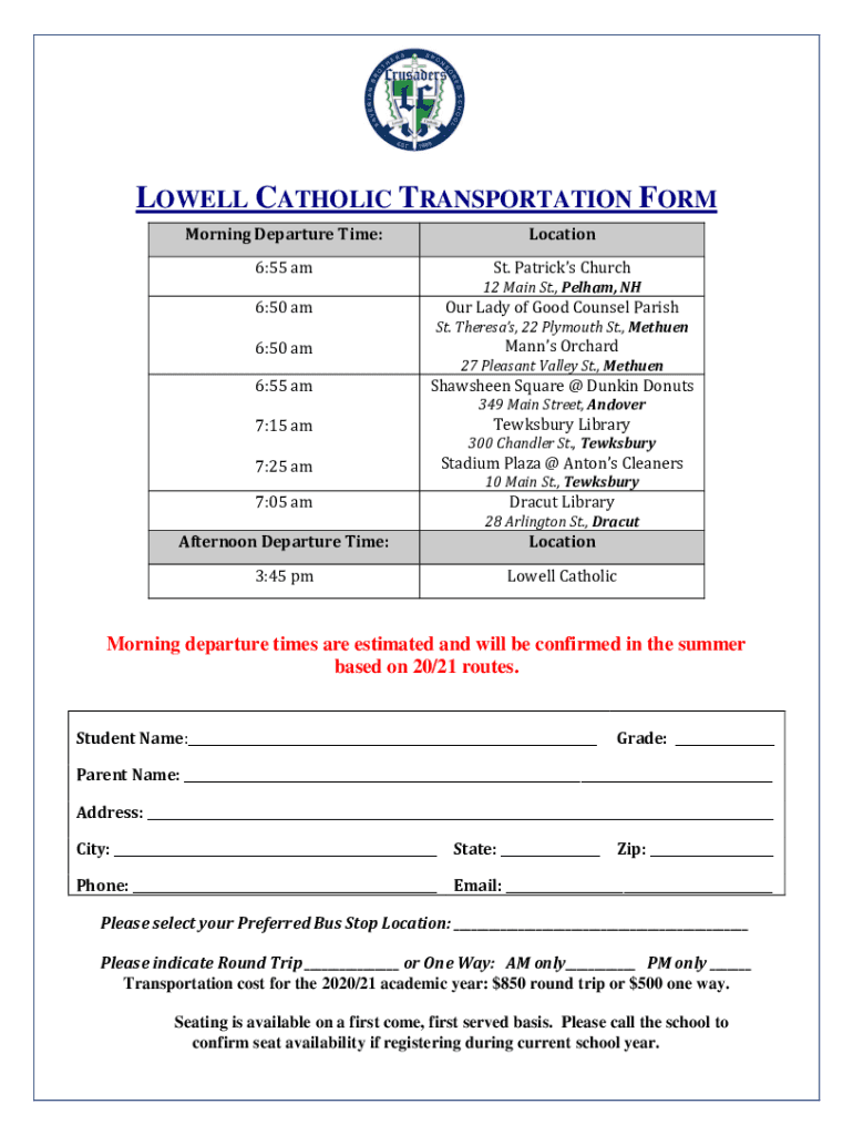 LOWELL CATHOLIC TRANSPORTATION FORM