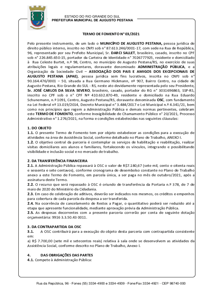 PREFECTURE MUNICIPAL DE AUGUSTO PESTANATERMO DE FOMENT N 03/2021