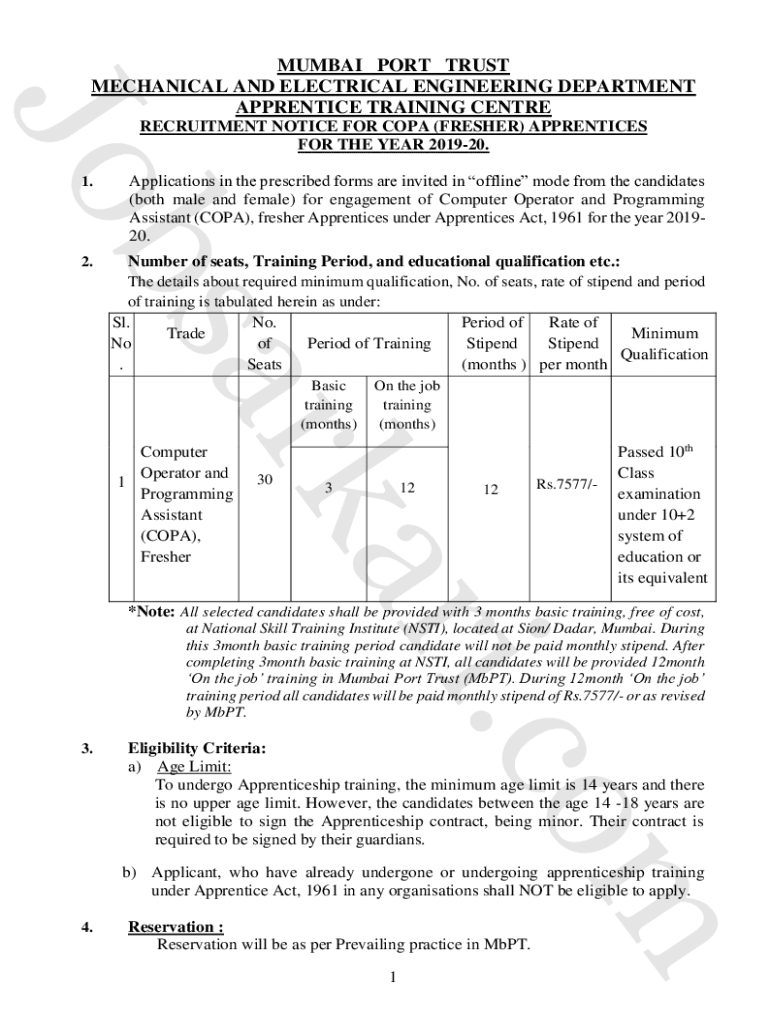 Cori. Key AR BS Mumbai PORT TRUST MECHANICAL AND ELECTRICAL ENGINEERING DEPARTMENT APPRENTICE TRAINING Center RECRUITMENT NOTICE FOR COPY (FRESHER) APPRENTICES FOR THE YEAR 201920.1. Applications