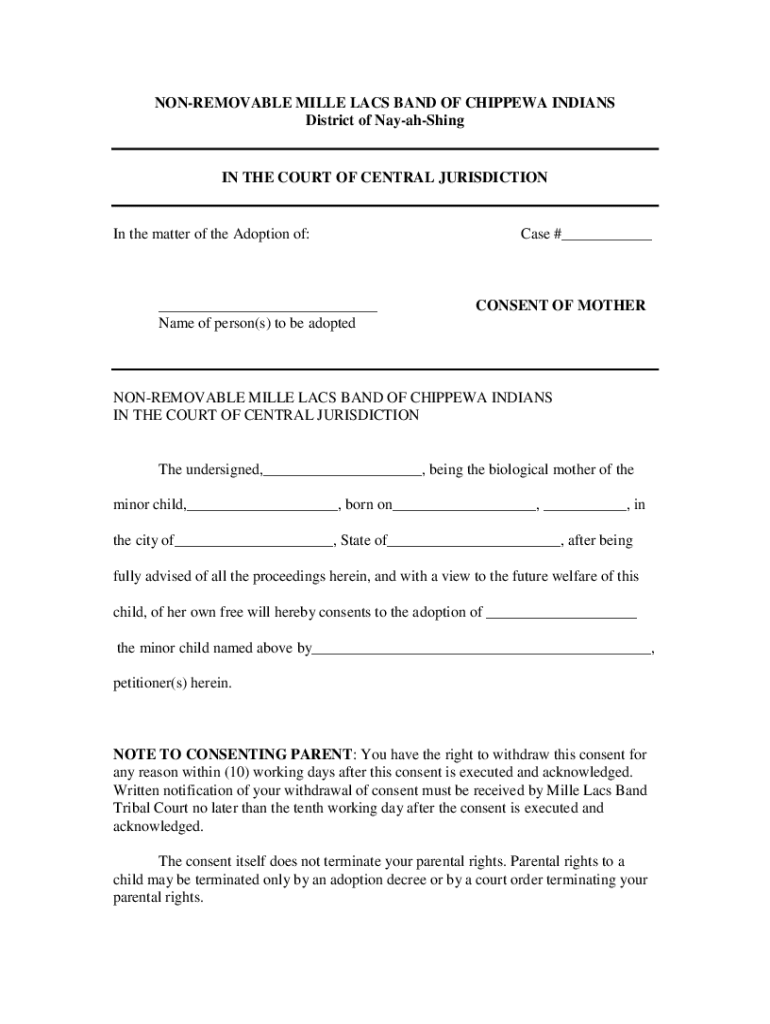 Name of person(s) to be adopted Case #___CONSENT OF MOTHERNONREMOVABLE