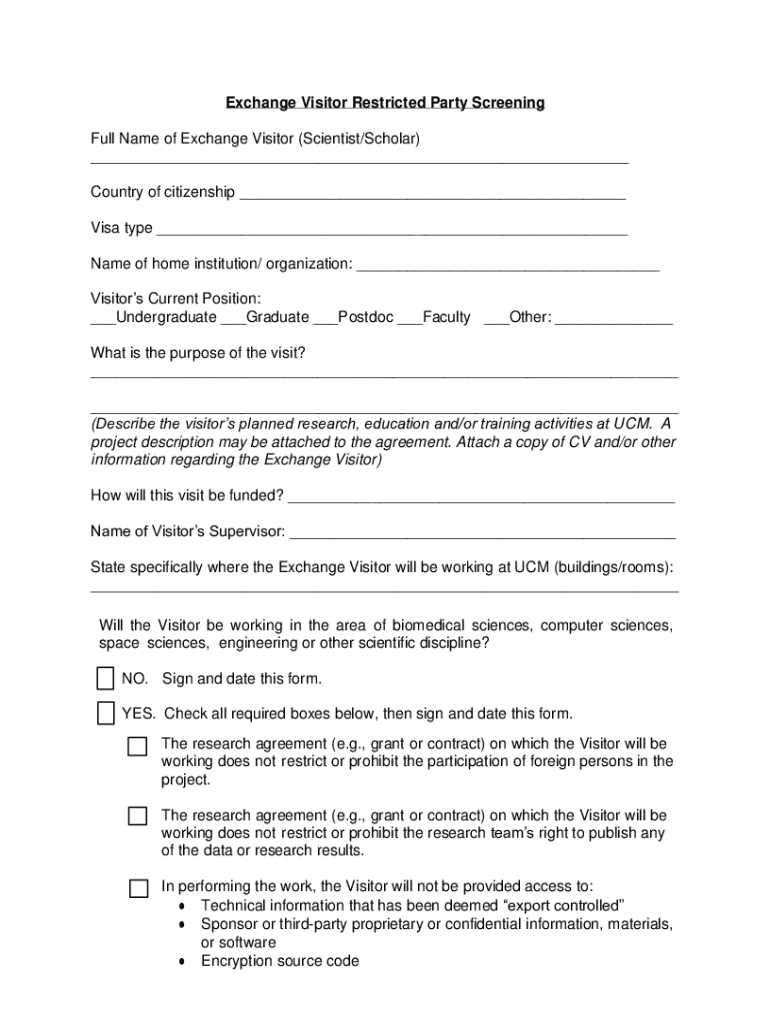 Exchange Visitor Restricted Party Screening Full Name of Exchange Visitor (Scientist/Scholar) ___ Country of citizenship ___ Visa type ___ Name of home institution/ organization: ___ Visitors Current