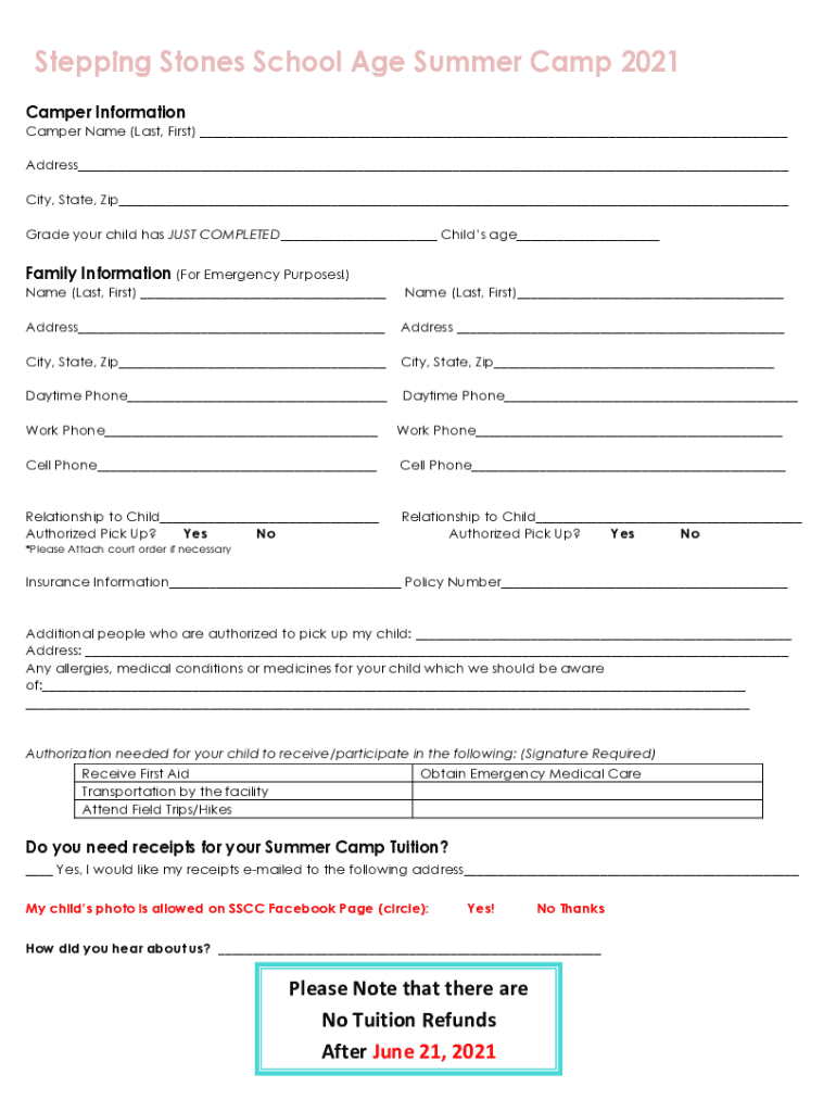 Stepping Stones School Age Summer Camp 2021 Camper InformationCamper Name (Last, First) ___ Address___ City, State, Zip___ Grade your child has JUST COMPLETED___ Childs age___Family Information (For
