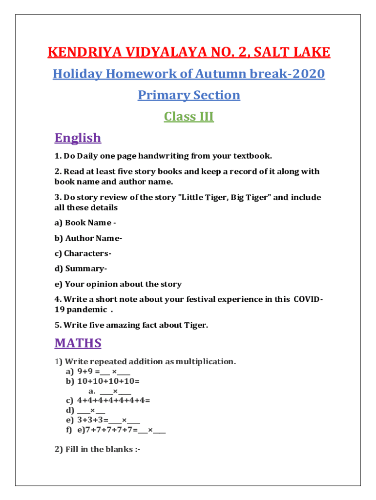 KENDRA HIMALAYA NO. 2, SALT LAKE Holiday Homework of Autumn break2020 Primary Section Class III English 1. Do Daily one-page handwriting from your textbook. 2. Read at least five story books and keep