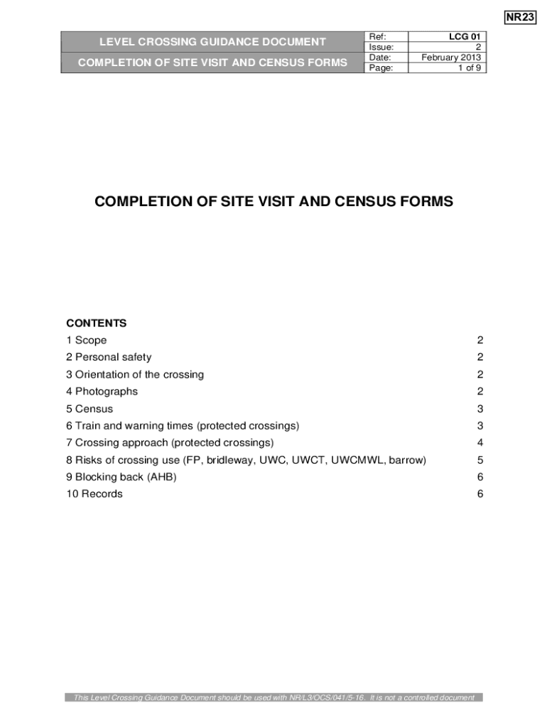 NR23 LEVEL CROSSING GUIDANCE DOCUMENT COMPLETION OF SITE VISIT AND CENSUS Former: Issue: Date: Page:LEG 01 2 February 2013 1 of 9COMPLETION OF SITE VISIT AND CENSUS FORMSCONTENTS 1 Scope22 Personal
