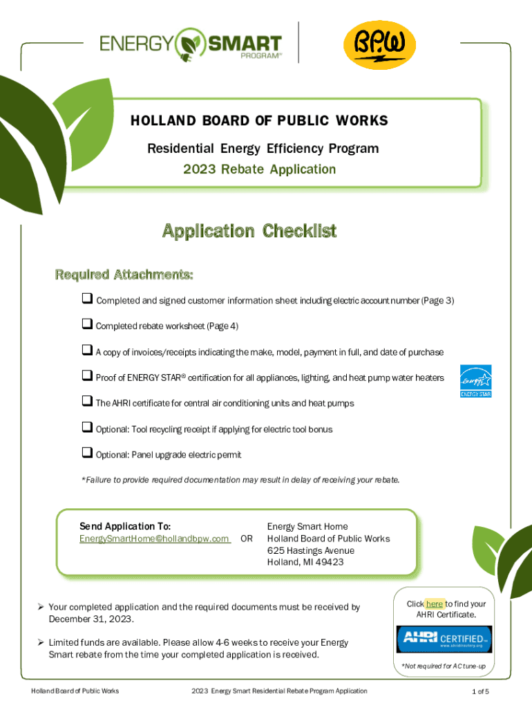 HOLLAND BOARD OF PUBLIC WORKS Residential Energy Efficiency Program 2023 Rebate ApplicationApplication Checklist Required Attachments: Completed and signed customer information sheet including electric