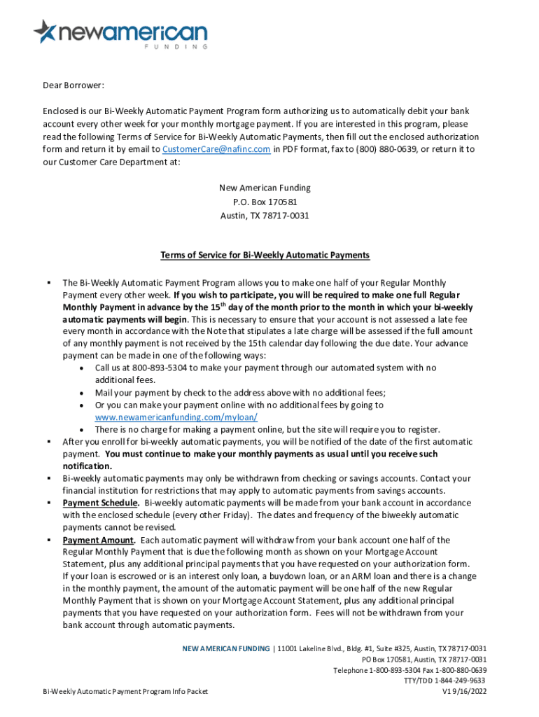Dear Borrower: Enclosed is our Biweekly Automatic Payment Program form authorizing us to automatically debit your bank account every other week for your monthly mortgage payment. If you are interested
