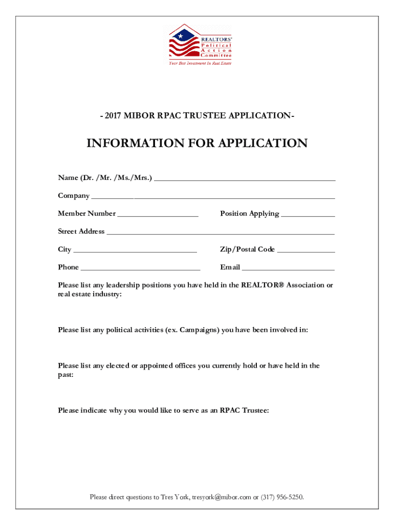 2017 MINOR PAC TRUSTEE INFORMATION FOR APPLICATION MINOR REALTORS POLITICAL ACTION COMMITTEE (MINOR PAC) is a bipartisan political organization operated to support candidates for local political office