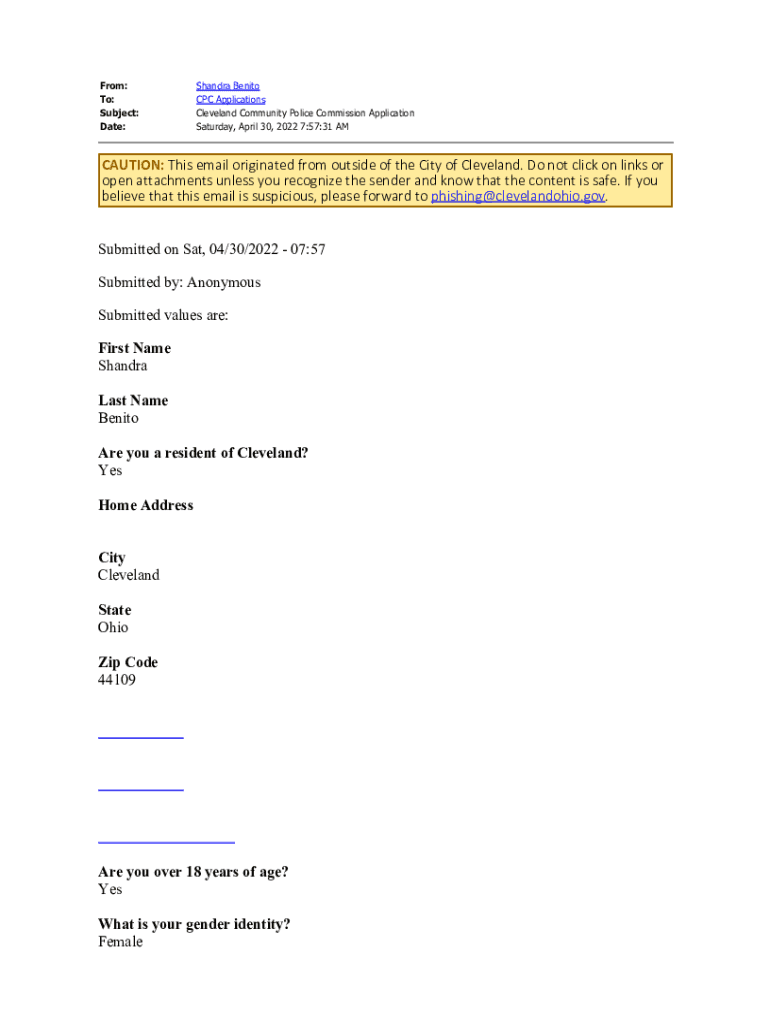 From: To: Subject: Date:Chandra Benito CPC Applications Cleveland Community Police Commission Application Saturday, April 30, 2022 7:57:31 CAUTION: This email originated from outside the City of Cleveland.