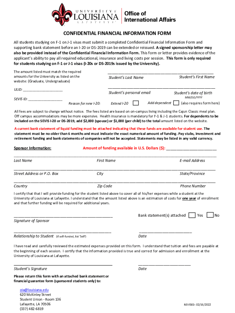CONFIDENTIAL FINANCIAL INFORMATION FORM All students studying on F1 on J1 visas must submit a completed Confidential Financial Information Form and supporting bank statement before an I20 or DS2019