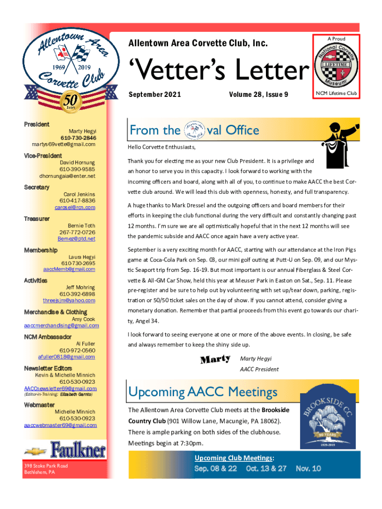 A Proud Allentown Area Corvette Club, Inc. Letters Letter September 2021President Marty Hey 6107302846 martys69vette@gmail.comVicePresident David Morning 6103909585 dhornungaia@enter.netSecretary