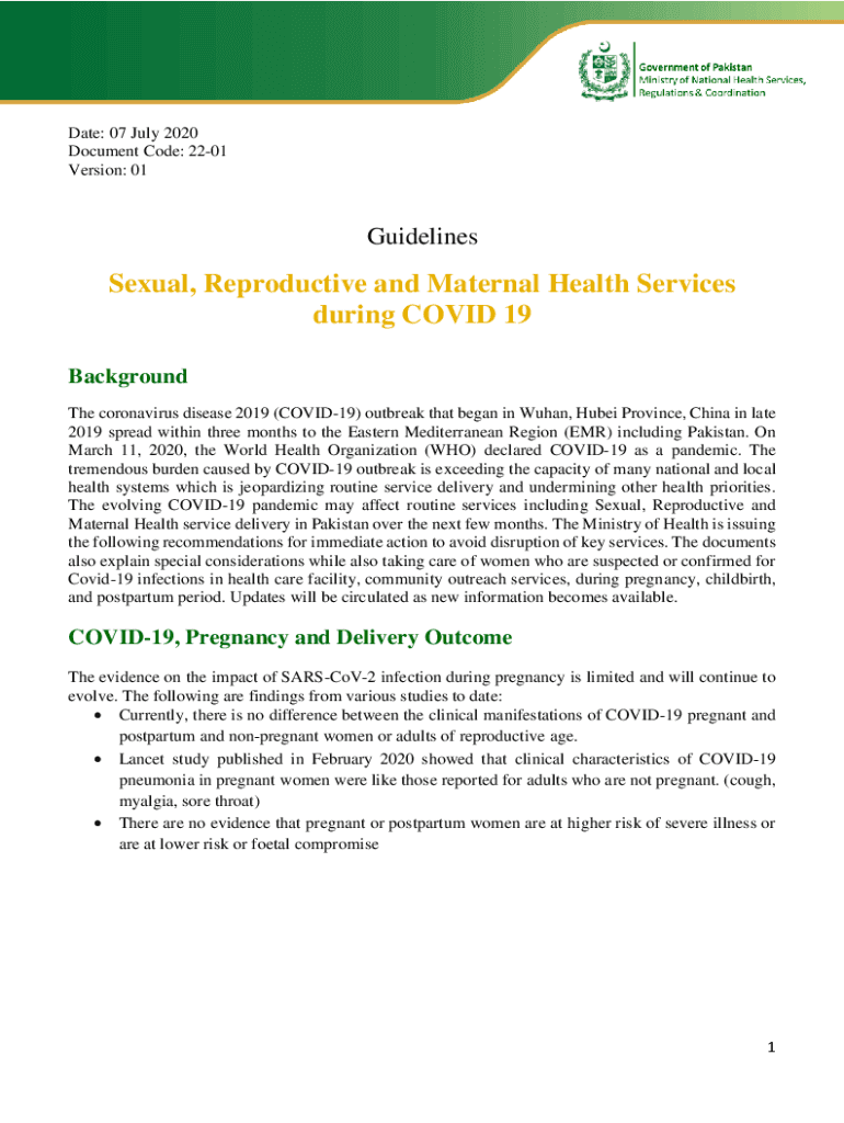 Date: 07 July 2020 Document Code: 2201 Version: 01GuidelinesSexual, Reproductive and Maternal Health Services during COVID-19 Background The coronavirus disease 2019 (COVID-19) outbreak that began