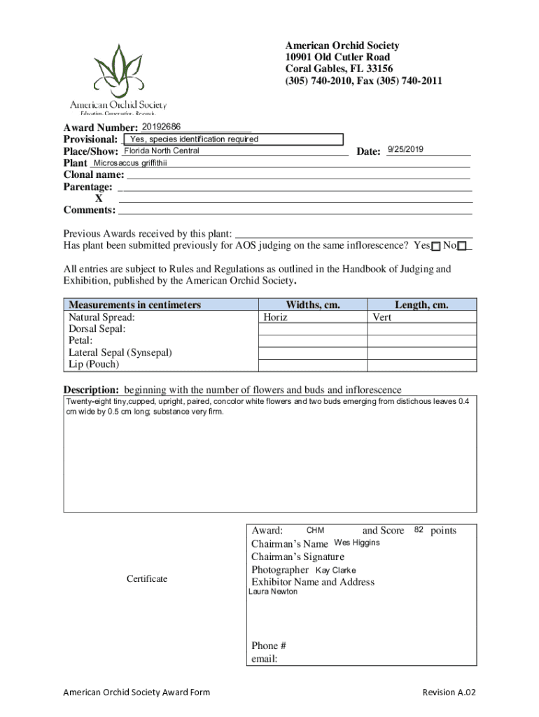 American Orchid Society 10901 Old Cutler Road Coral Gables, FL 33156 (305) 7402010, Fax (305) 7402011Award Number: ___ Provisional: ___ Place/Show: ___ Date: ___ Plant ___ Clonal name: ___ Parentage: