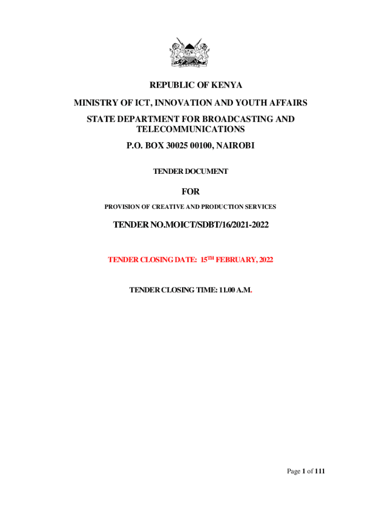REPUBLIC OF KENYA MINISTRY OF ICT, INNOVATION AND YOUTH AFFAIRS STATE DEPARTMENT FOR BROADCASTING AND TELECOMMUNICATIONS P.O. BOX 30025 00100, NAIROBI TENDER DOCUMENT PROVISION OF CREATIVE AND PRODUCTION