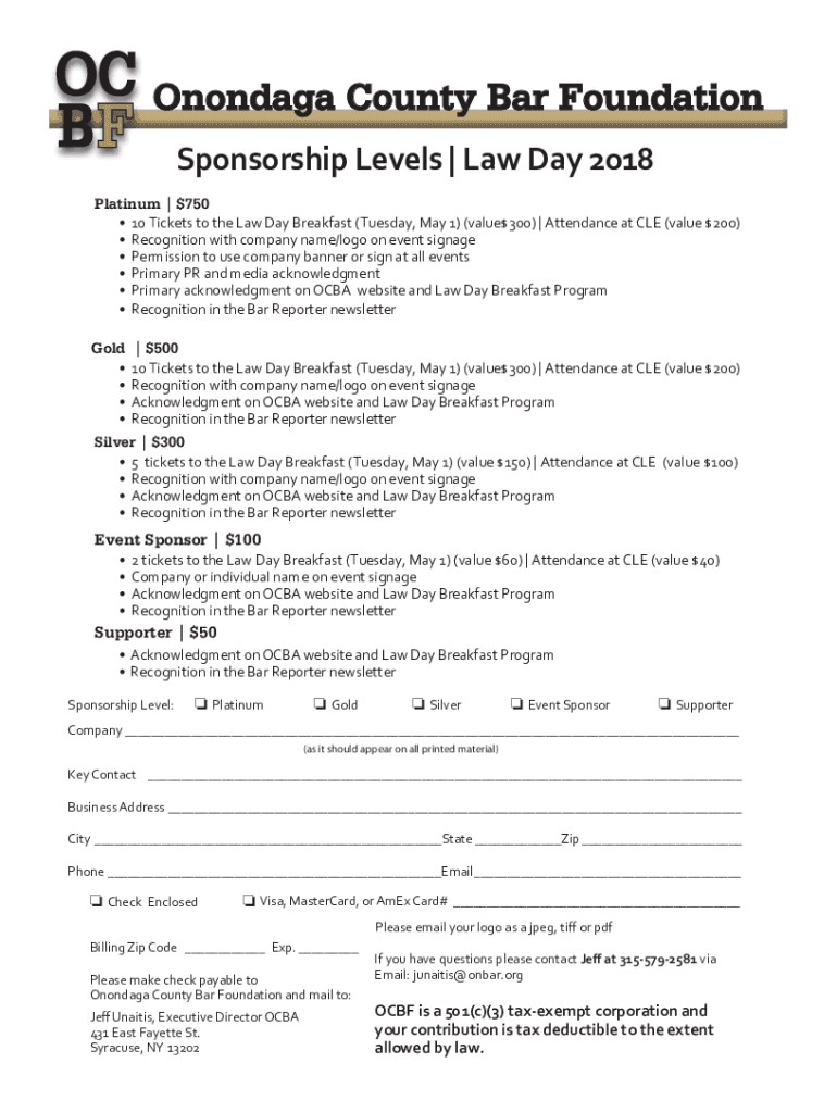 Onondaga County Bar Foundation Sponsorship Levels | Law Day 2018 Platinum | $750 10 Tickets to the Law Day Breakfast (Tuesday, May 1) (value$300) | Attendance at CLE (value $200) Recognition with
