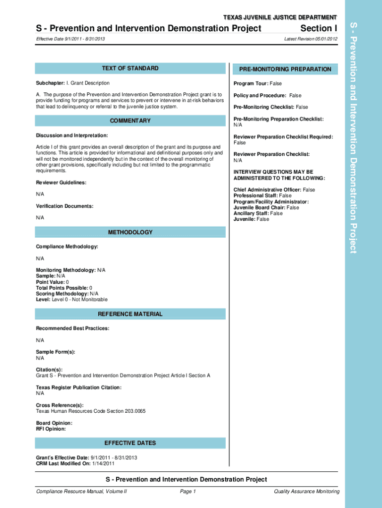 TEXAS JUVENILE JUSTICE DEPARTMENTSection Effective Date 9/1/2011 8/31/2013Latest Revision 05/01/2012TEXT OF STANDARDPREMONITORING PREPARATIONSubchapter: I. Grant DescriptionProgram Tour: False. The
