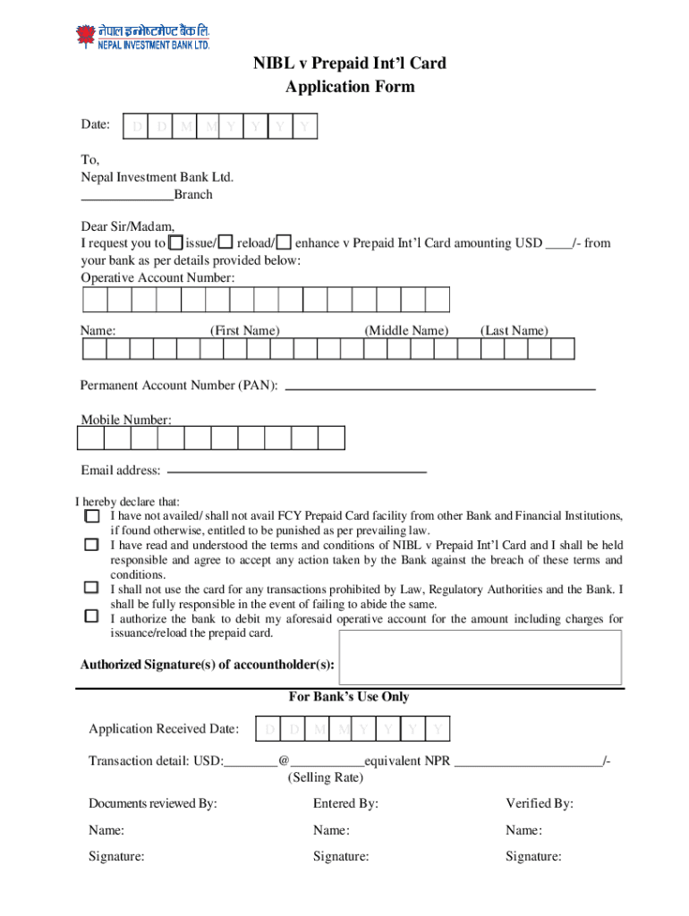 NBL v Prepaid Into Card Application Form Date:DDM M Kyoto, Nepal Investment Bank Ltd. Branch Dear Sir/Madam, I request you to issue/ reload/ enhance v Prepaid Into Card amounting USD ___/ from your