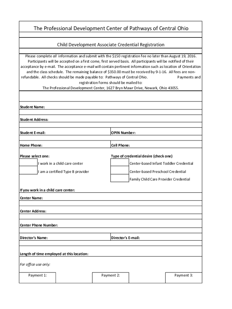 The Professional Development Center of Pathways of Central Ohio Child Development Associate Credential Registration Please complete all information and submit with the $150 registration fee no later