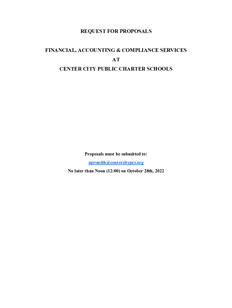 REQUEST FOR PROPOSALS FINANCIAL, ACCOUNTING & COMPLIANCE SERVICES AT CENTER CITY PUBLIC CHARTER SCHOOLSProposals must be submitted to: aprsmith@centercitypcs.org No later than Noon (12:00) on October