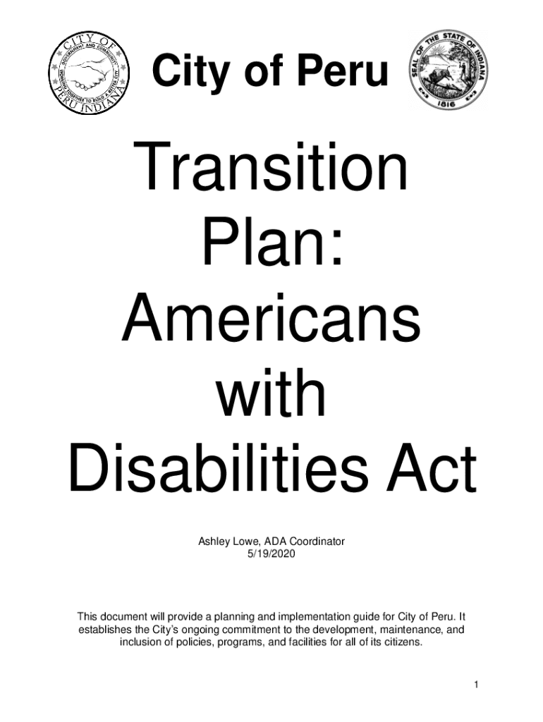 City of Peru. Transition Plan: Americans with Disabilities Act Ashley Lowe, ADA Coordinator 5/19/2020This document will provide a planning and implementation guide for City of Peru. It establishes