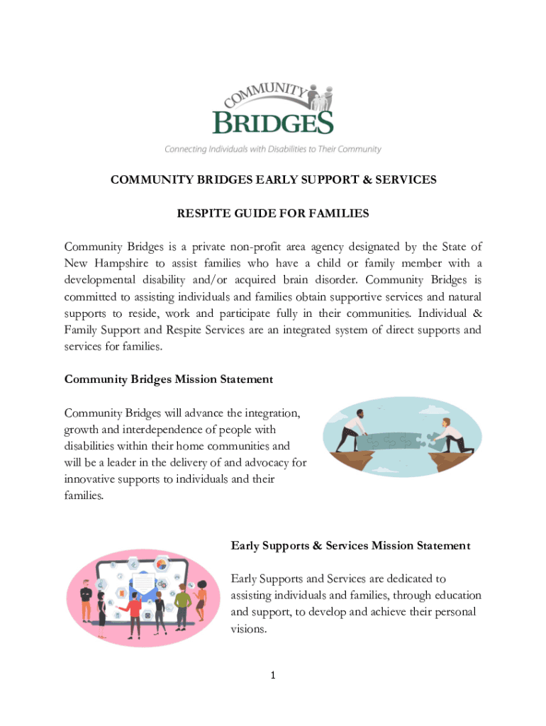 COMMUNITY BRIDGES EARLY SUPPORT & SERVICES RESPITE GUIDE FOR FAMILIES Community Bridges is a private nonprofit area agency designated by the State of New Hampshire to assist families who have a child