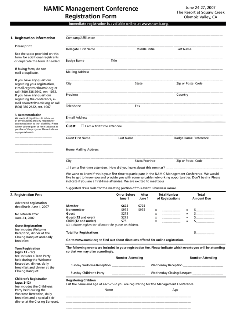 NAMC Management Conference Registration Form June 2427, 2007 The Resort at Squaw Creek Olympic Valley, Immediate registration is available online at www.namic.org.1. Registration Information___ Company/AffiliationPlease