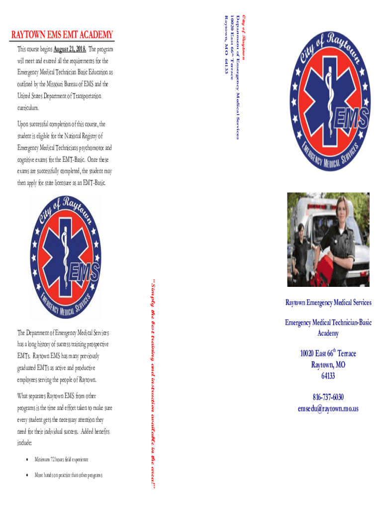 City of Ray town Department of Emergency Medical Services 10020 East 66th Terrace Ray town, MO 64133RAYTOWN EMS EMT ACADEMY This course begins August 21, 2018. The program will meet and exceed all