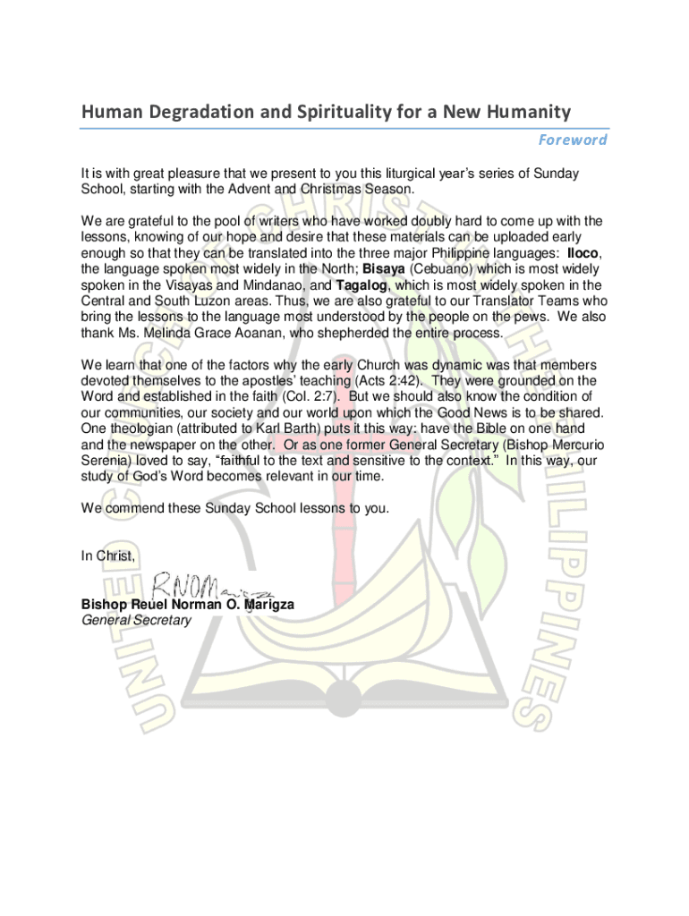 Human Degradation and Spirituality for a New Humanity Foreword It is with great pleasure that we present to you this liturgical years' series of Sunday School, starting with the Advent and Christmas