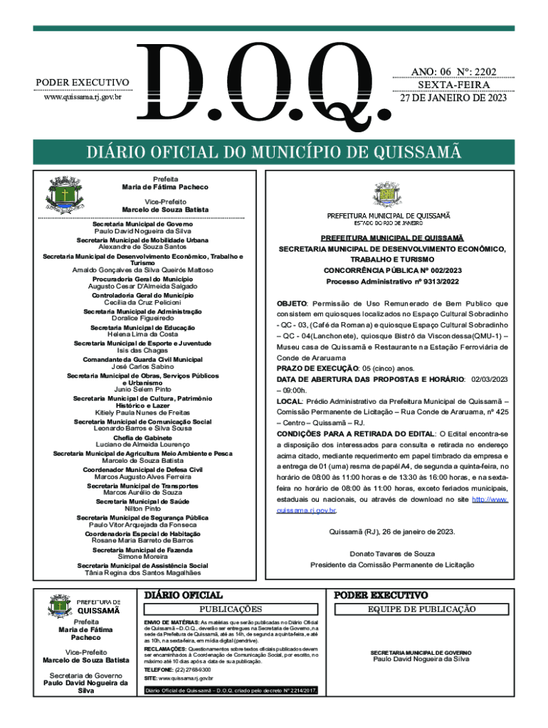 1ANO: 06 N: 2202 SEXTAFEIRA 27 DE Janeiro DE 2023PODER EXECUTIVE www.quissama.rj.gov.brPrefeita Maria de Ftima Pacheco VicePrefeito Marcelo de Souza Batista Secretariat Municipal de GovernoPaulo David