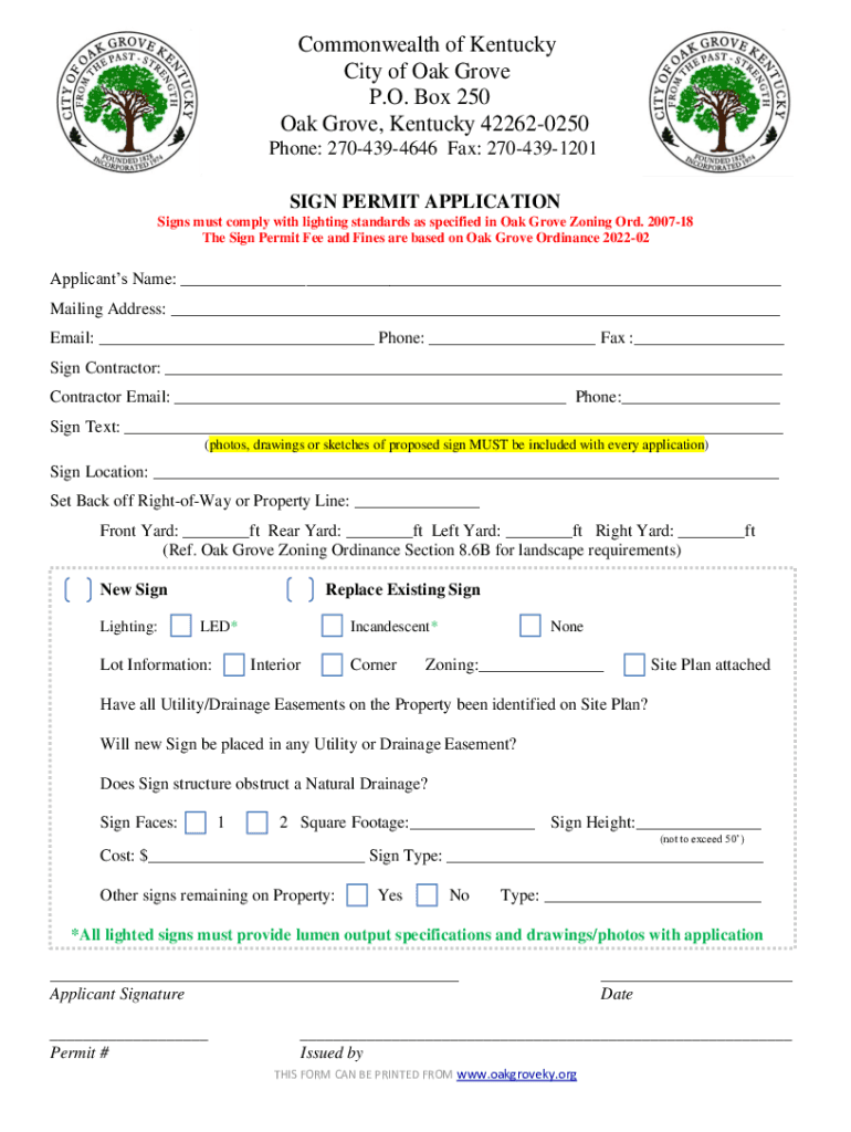 Commonwealth of Kentucky City of Oak Grove P.O. Box 250 Oak Grove, Kentucky 422620250 Phone: 2704394646 Fax: 2704391201 SIGN PERMIT APPLICATION Signs must comply with lighting standards as specified