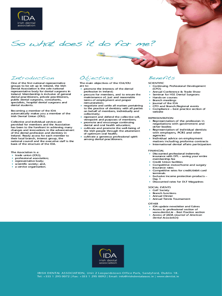 So what does it do for me? IntroductionObjectivesBenefitsOne of the first national representative groups to be set up in Ireland, the Irish Dental Association is the sole national representative body