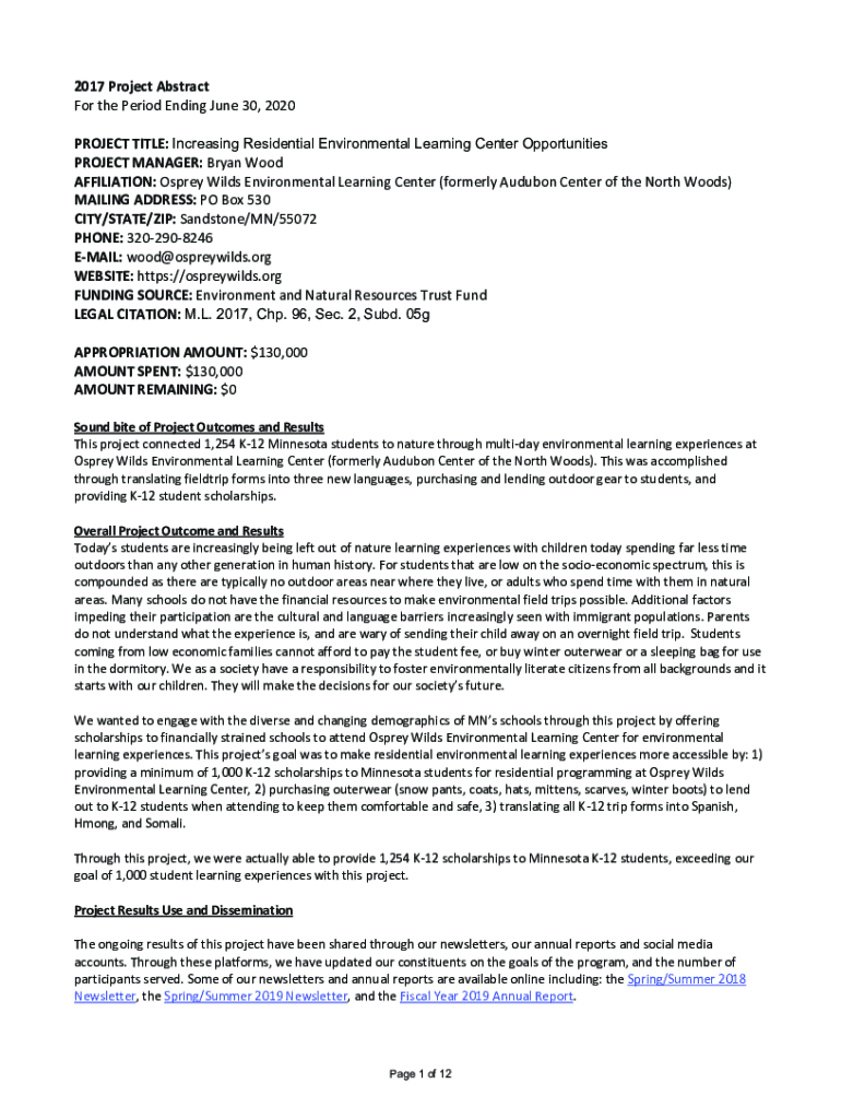 2017 Project Abstract For the Period Ending June 30, 2020, PROJECT TITLE: Increasing Residential Environmental Learning Center Opportunities PROJECT MANAGER: Bryan Wood AFFILIATION: Osprey Wilds Environmental